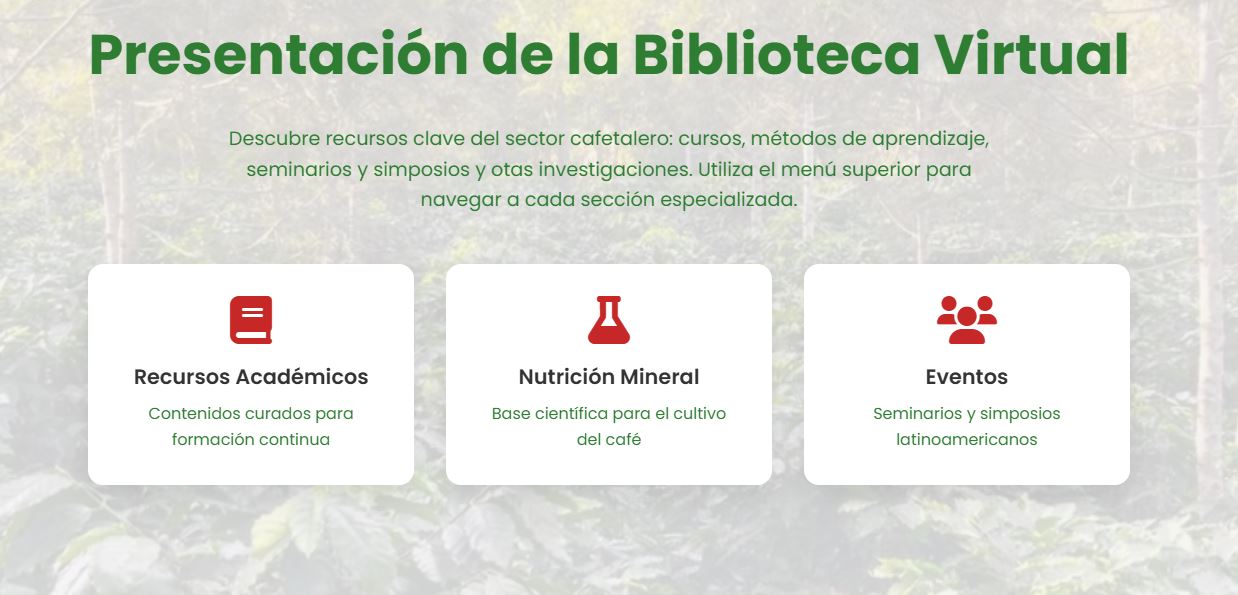 La Biblioteca Virtual IHCAFE con el objetivo de brindar un acceso ágil y sencillo a una amplia variedad de recursos digitales relacionados con el café, su producción, historia, innovación y desarrollo sostenible. investigadores y público en general puedan consultar libros, documentos técnicos, manuales y material educativo especializado desde cualquier lugar y en cualquier momento.